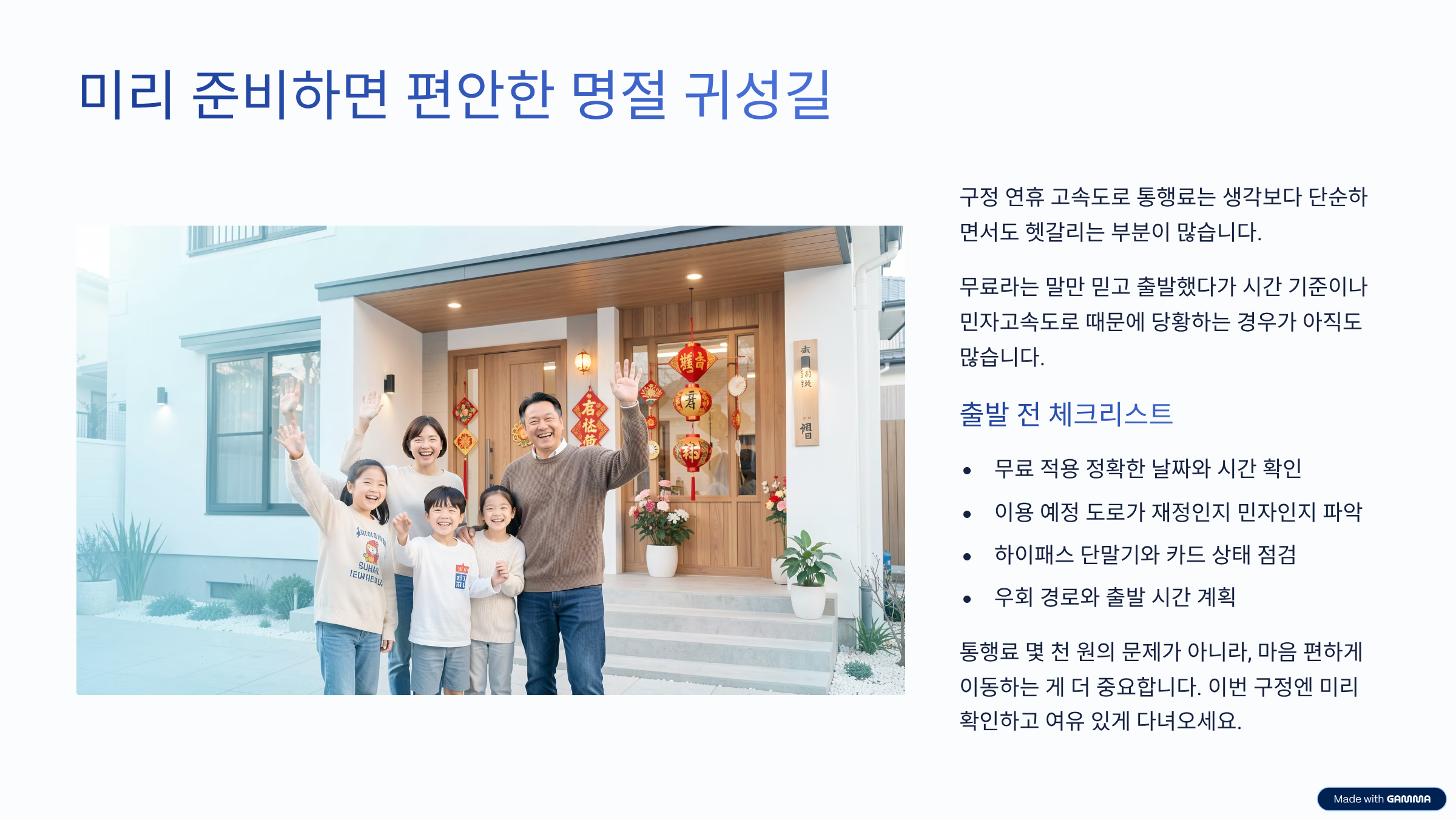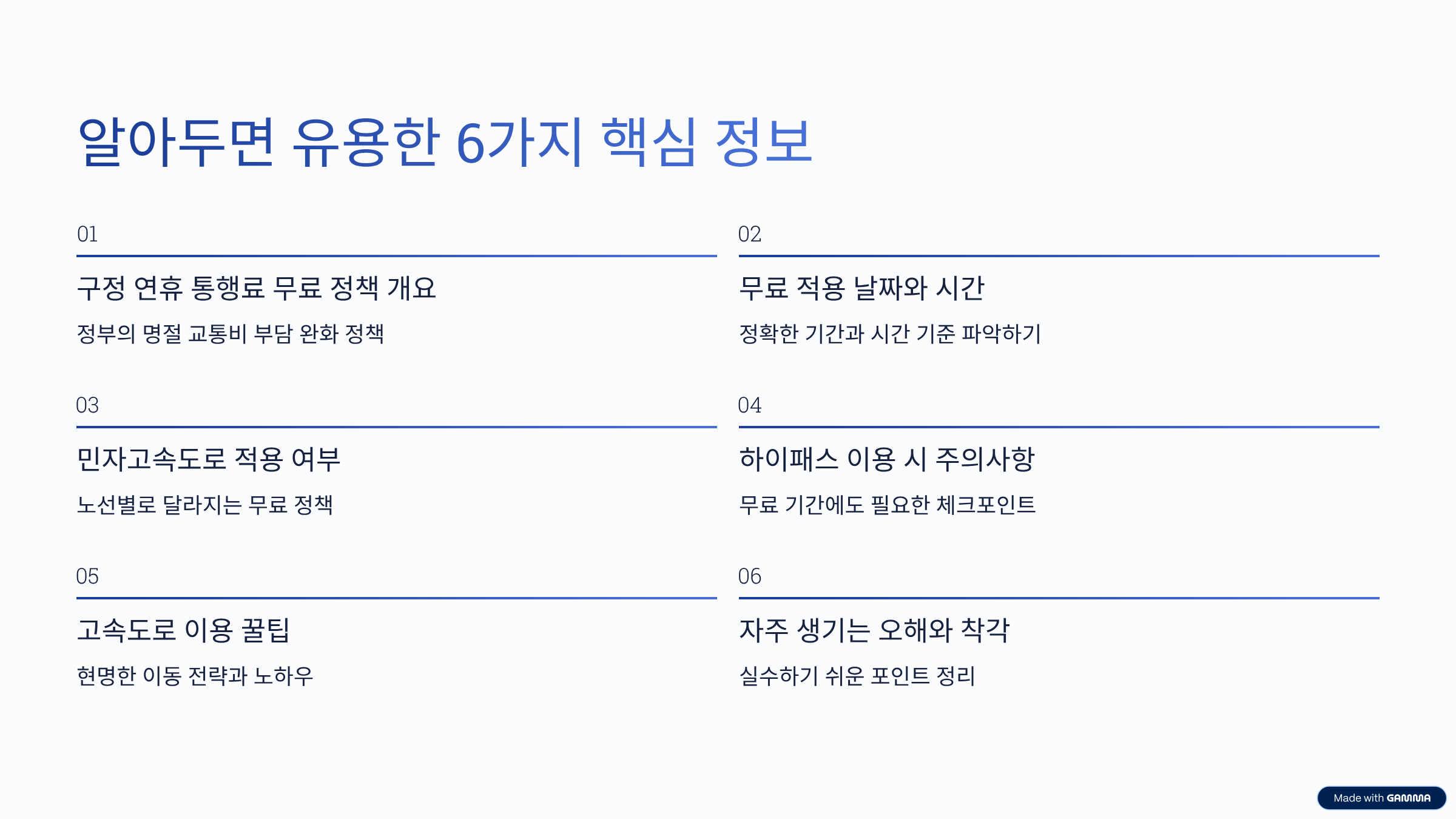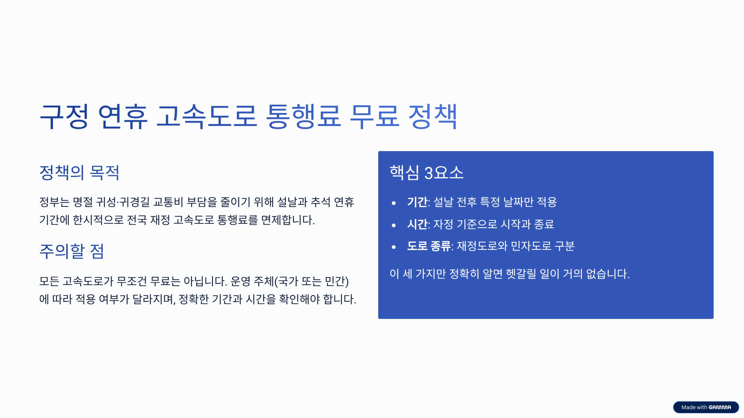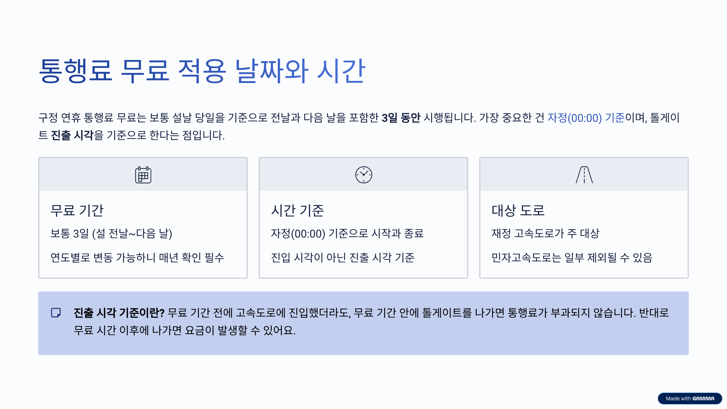 핵심만 정리하면, 구정 연휴 고속도로 통행료 무료 정책은 ‘기간·시간·도로 종류’ 이 세 가지만 정확히 알면 헷갈릴 일이 거의 없습니다.