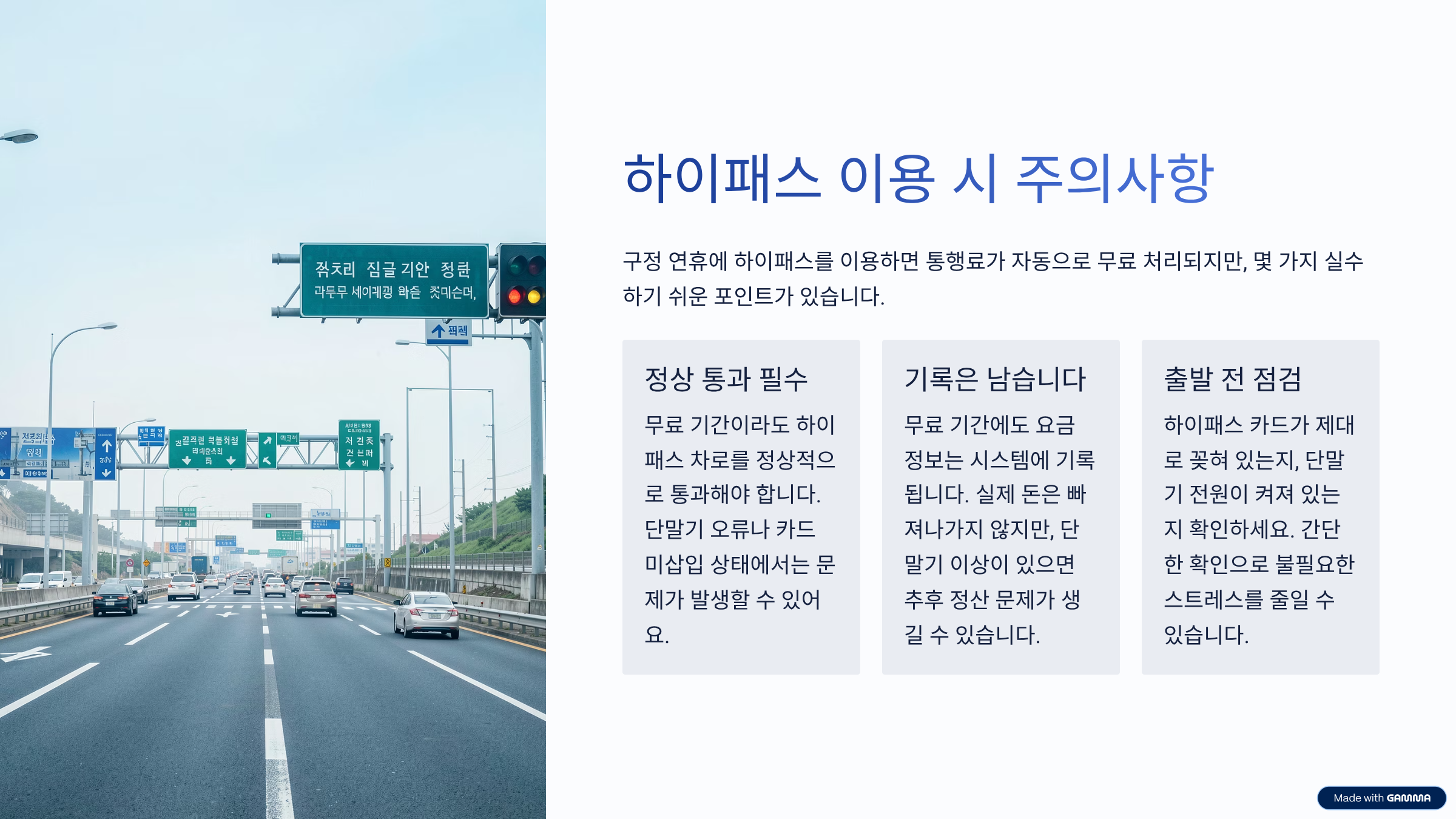 출발 전에 하이패스 카드가 제대로 꽂혀 있는지, 단말기 전원이 켜져 있는지만 확인해도 불필요한 스트레스를 꽤 줄일 수 있어요.