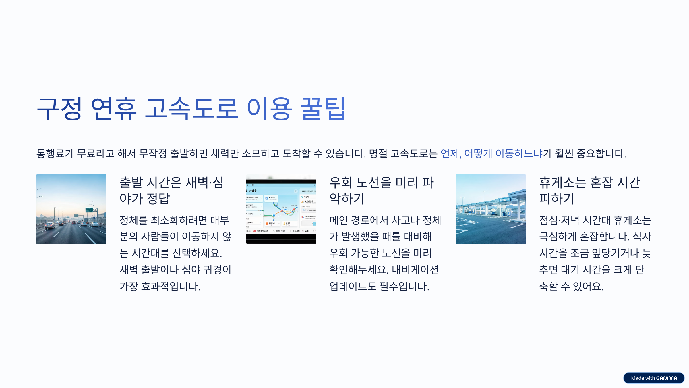 | 출발 시간 | 새벽·심야 | 정체 최소화 |