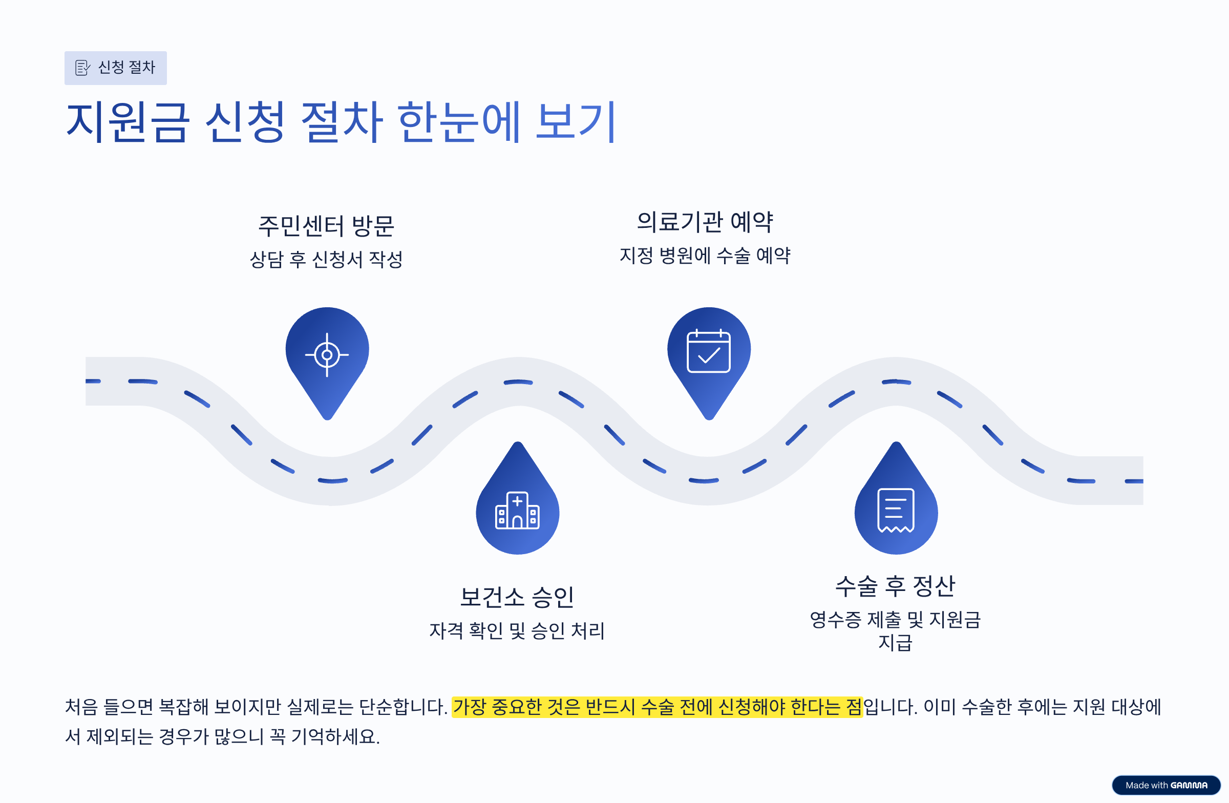 처음 들으면 복잡해 보이지만, 실제로 해보면 생각보다 절차는 단순한 편이에요. 중요한 건 수술 전에 반드시 신청해야 한다는 점입니다. 저도 이걸 몰랐으면 큰일 날 뻔했어요. 이미 수술을 하고 나면 지원 대상에서 제외되는 경우가 많거든요.