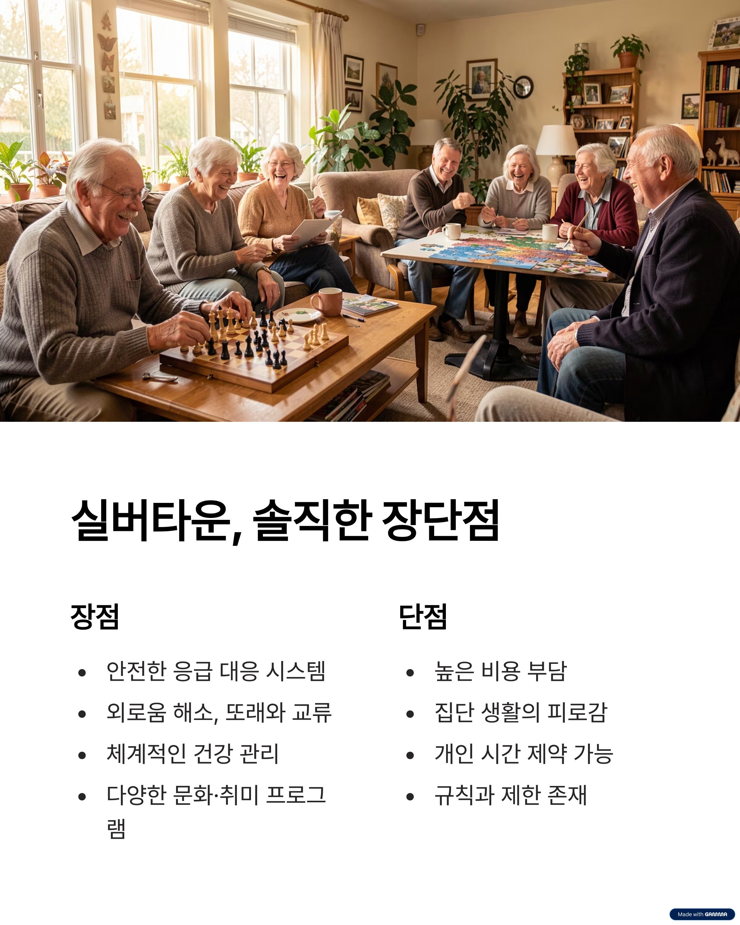 장점부터 보면, 안전과 외로움 감소는 확실해요. 응급 상황 대응 시스템, 상주 인력, 그리고 무엇보다 비슷한 또래가 늘 곁에 있다는 게 큽니다. 반대로 단점은 비용 부담과 집단 생활에서 오는 피로감이에요. 혼자만의 시간이 줄어든다고 느끼는 분들도 있고요.