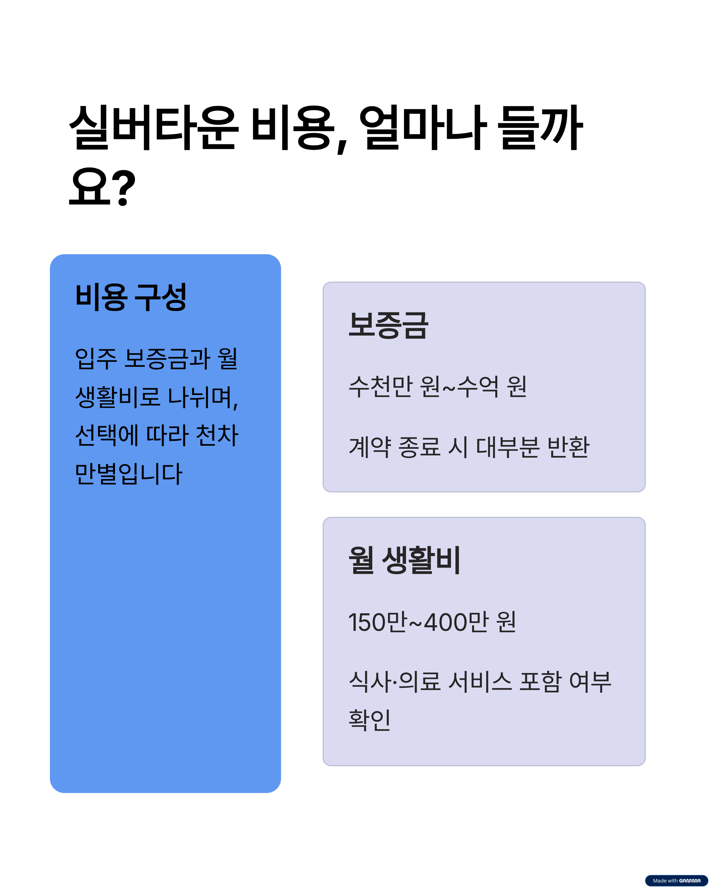 보증금은 수천만 원부터 수억 원까지 정말 다양해요. 대신 계약 종료 시 상당 부분을 돌려받는 구조라 완전히 사라지는 돈은 아닙니다. 월 생활비는 보통 150만 원~400만 원 선인데, 식사 포함 여부, 의료 서비스 수준에 따라 차이가 큽니다.