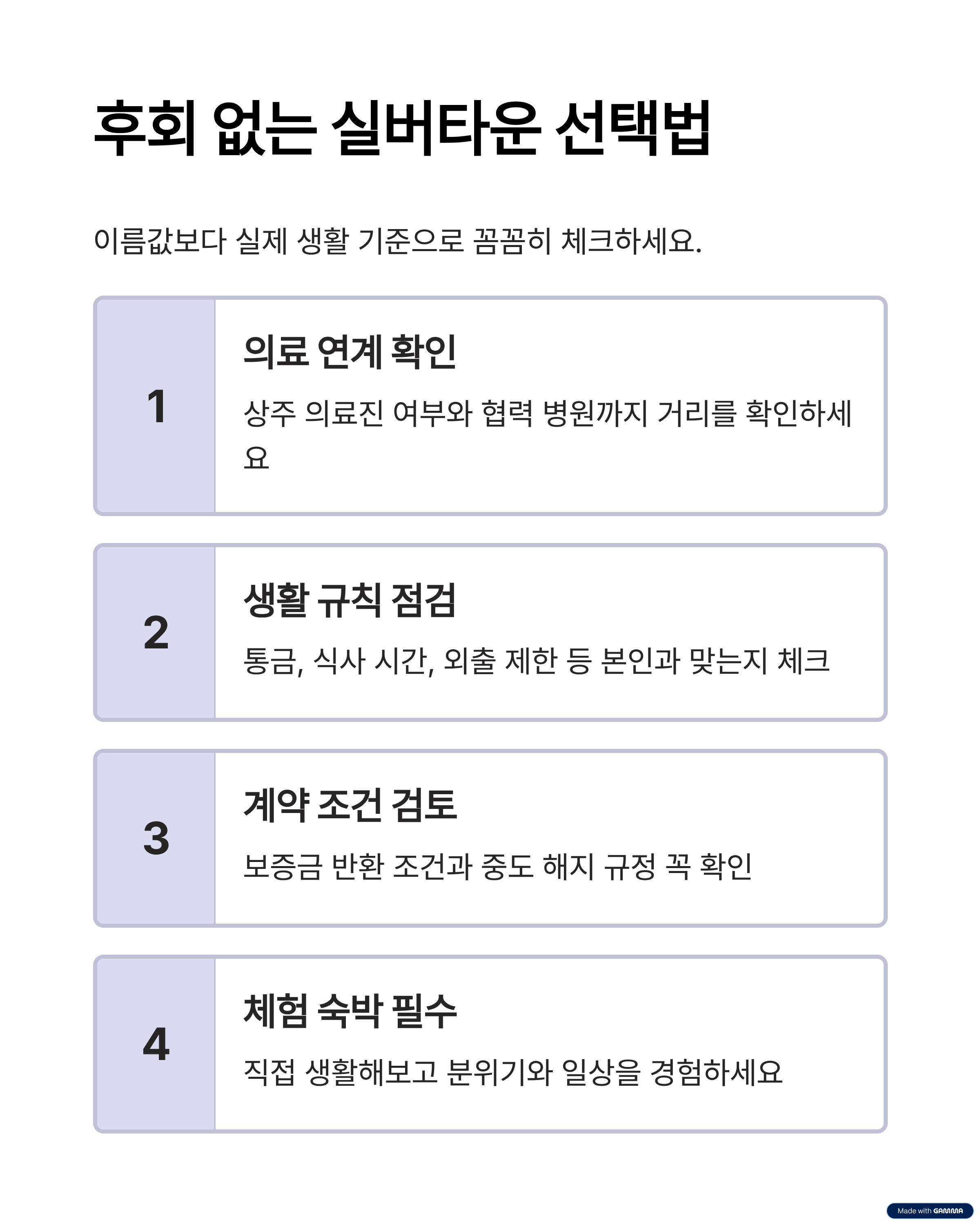 실버타운 선택에서 가장 중요한 건 “이름값”이 아니에요. 실제로 살아보는 일상 기준으로 봐야 합니다. 홍보 자료만 보고 결정했다가, 막상 입주 후에 생활 패턴이 안 맞아서 나오는 경우도 꽤 많거든요.