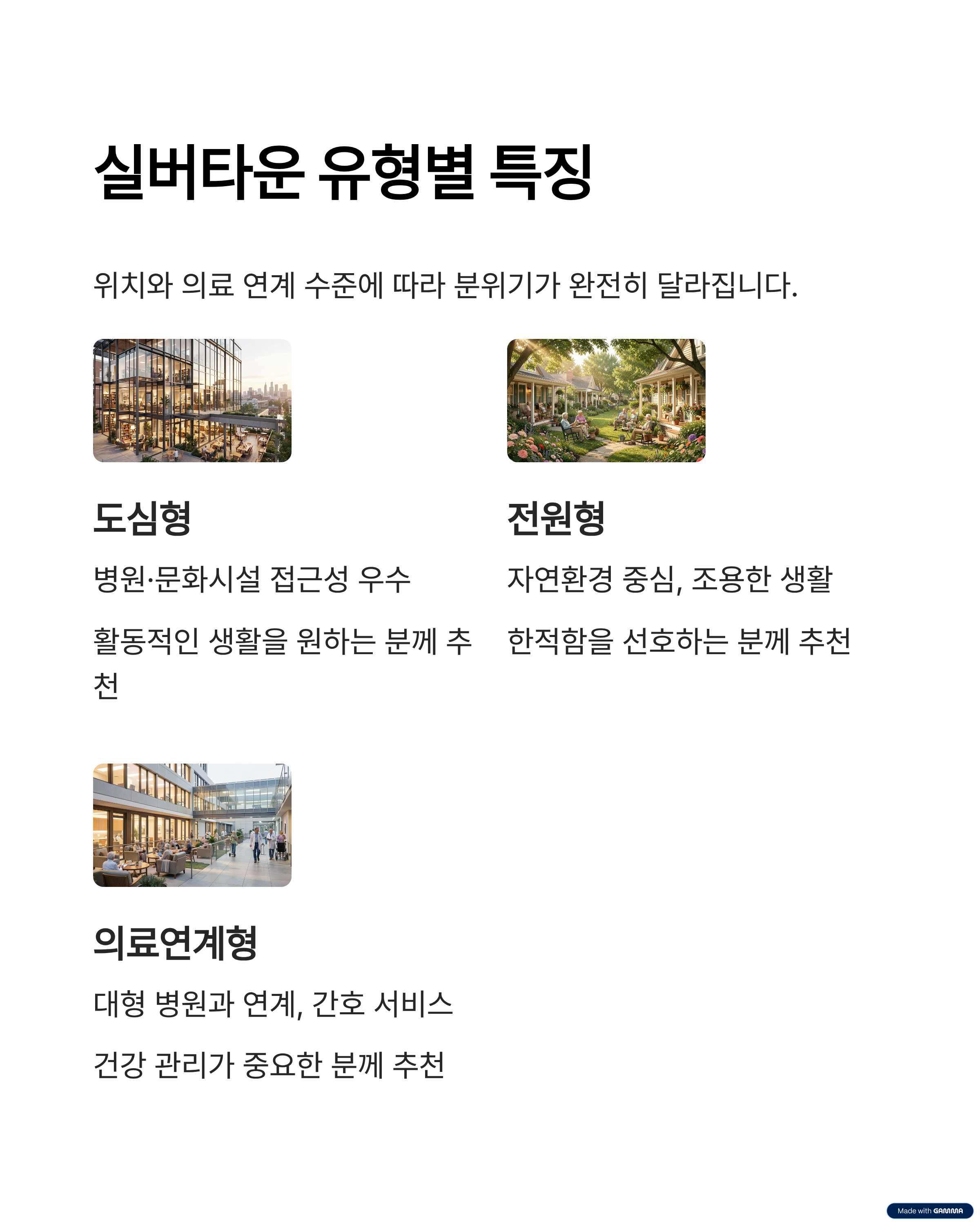 실버타운은 생각보다 종류가 다양해요. 위치, 의료 연계 수준, 자율성에 따라 분위기도 완전히 달라집니다. 그래서 “실버타운은 다 똑같다”는 생각으로 접근하면 실패 확률이 꽤 높아요.