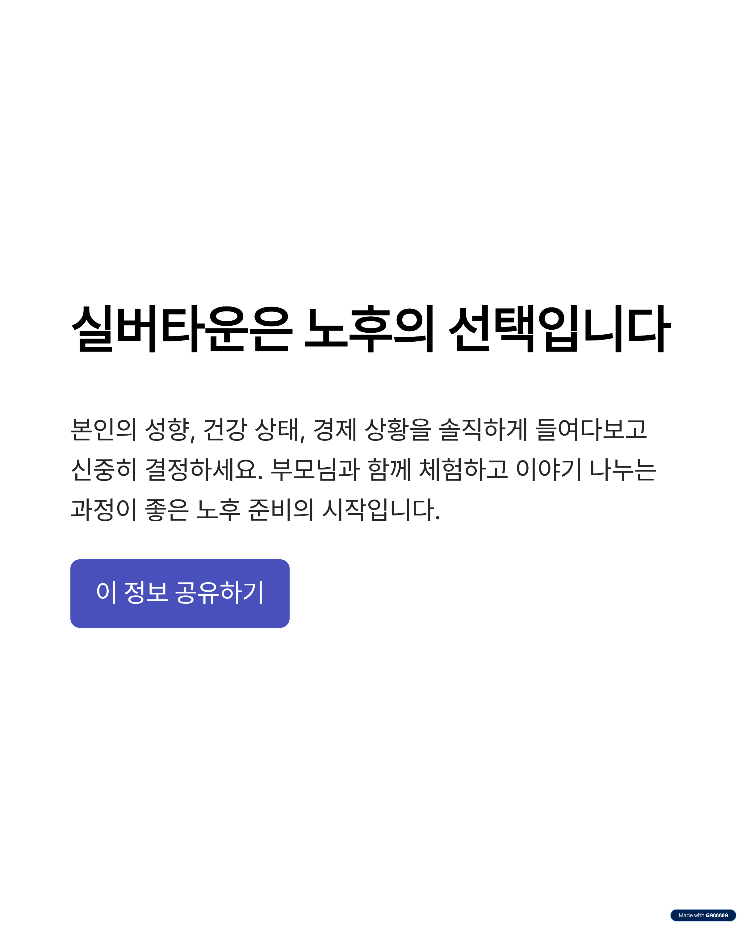 모든 분께 실버타운이 정답은 아니에요. 하지만 아래 항목에 고개가 끄덕여진다면, 한 번쯤은 진지하게 고려해볼 만합니다.