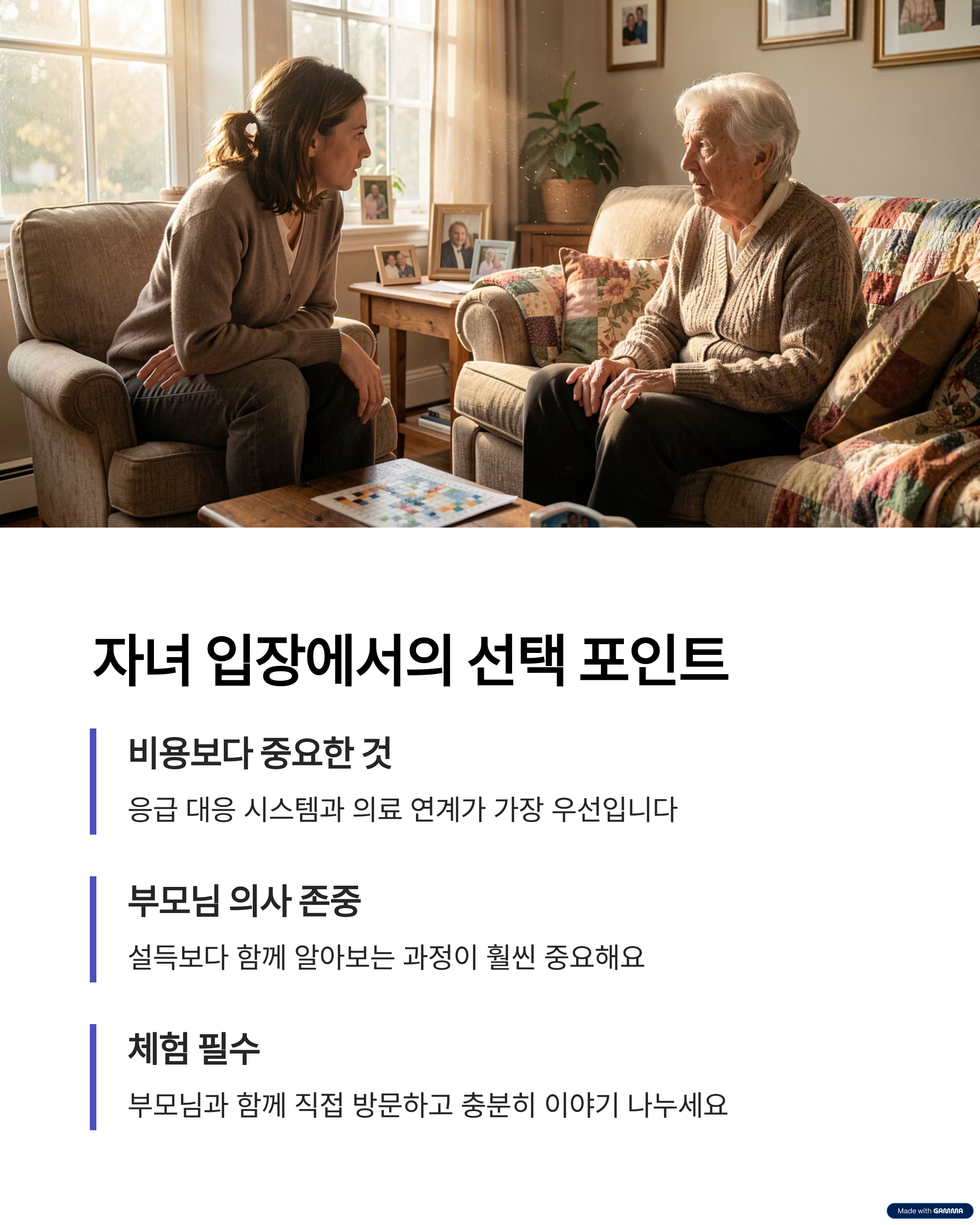비용보다도 응급 대응 시스템과 의료 연계입니다. 그리고 부모님 본인의 의사가 가장 중요해요. 설득보다 ‘함께 알아보는 과정’이 훨씬 중요합니다.
