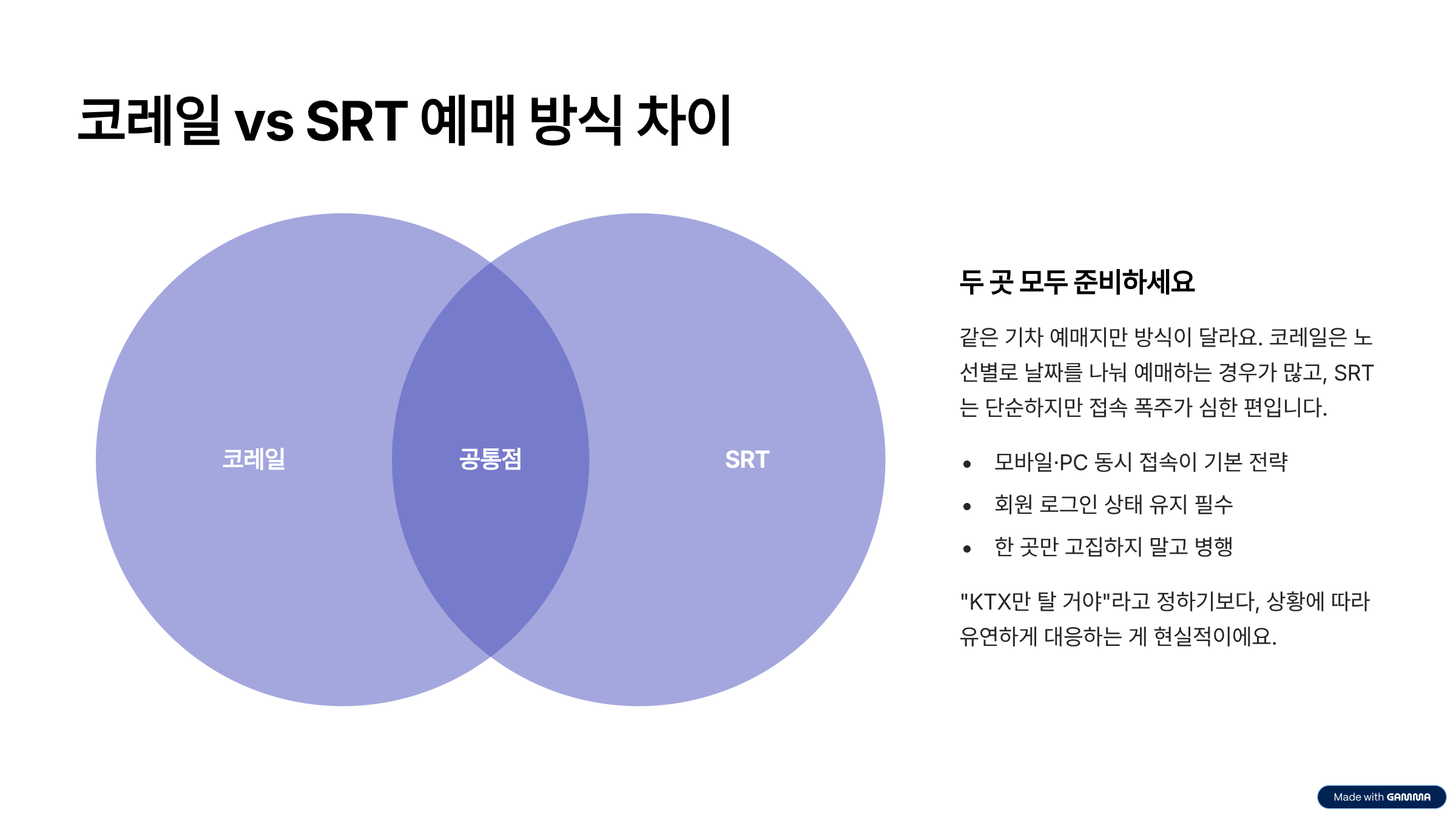 결론적으로는 둘 다 준비해두는 게 답이에요. “난 KTX만 탈 거야”라고 정해두기보다는, 상황에 따라 SRT까지 같이 노리는 게 훨씬 현실적이더라구요.