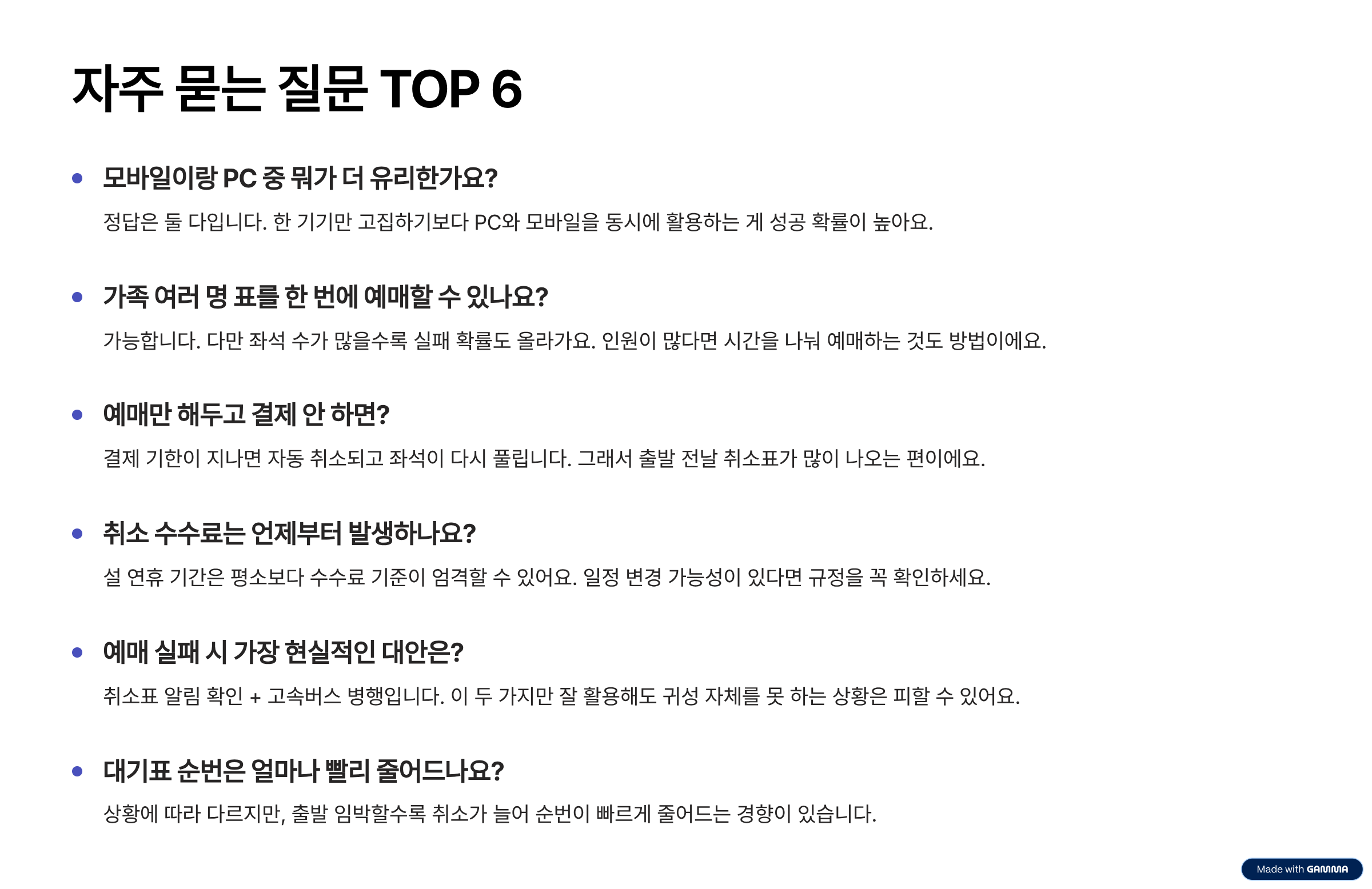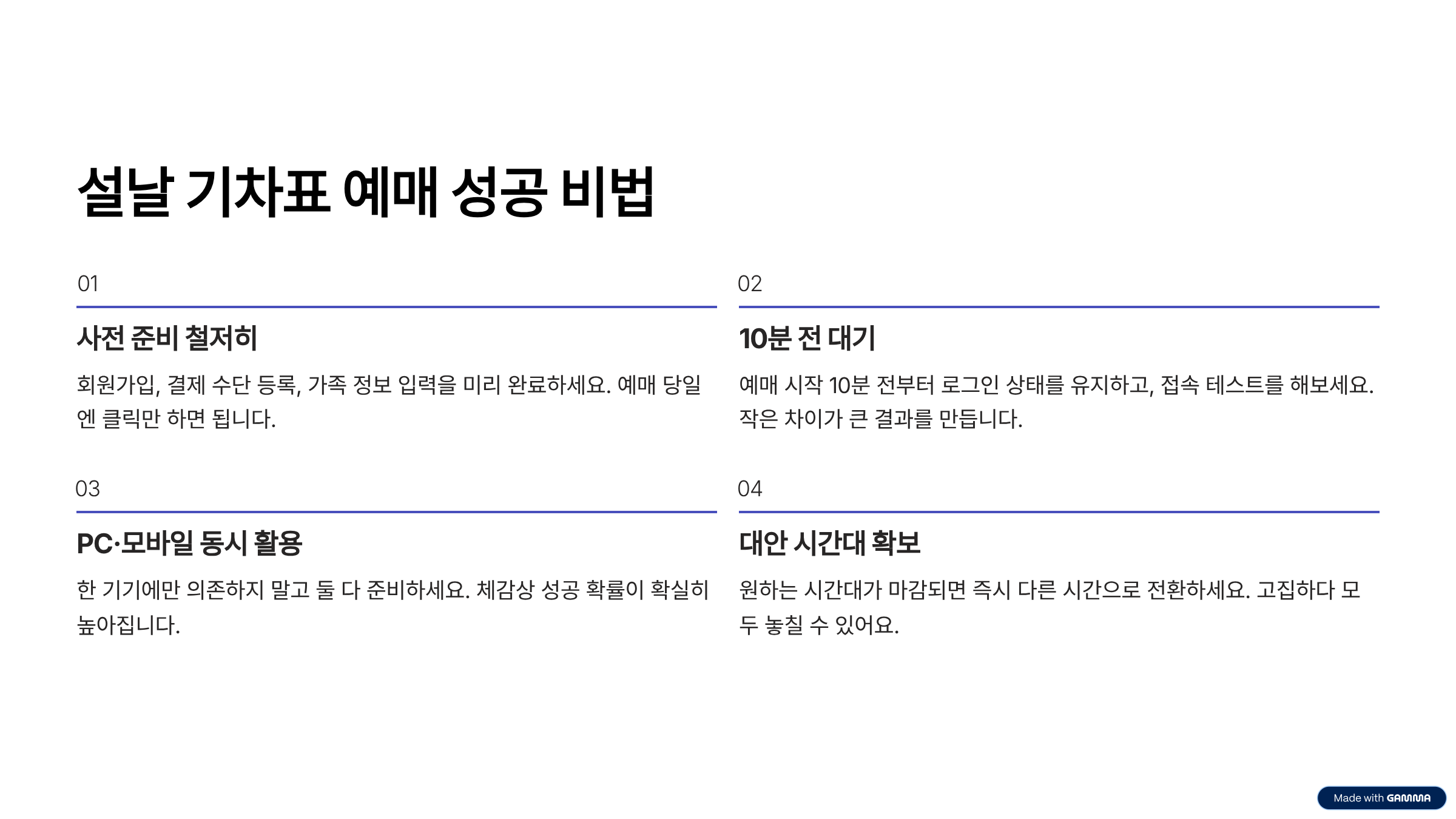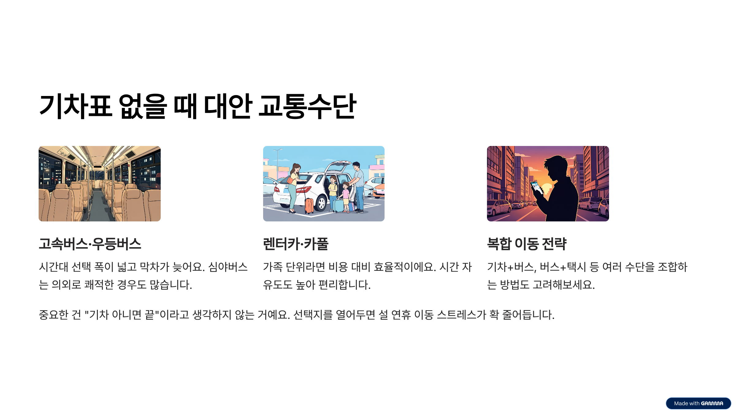 중요한 건 “기차 아니면 끝”이라고 생각하지 않는 거예요. 이렇게 선택지를 열어두면 설 연휴 이동 스트레스가 확 줄어듭니다.