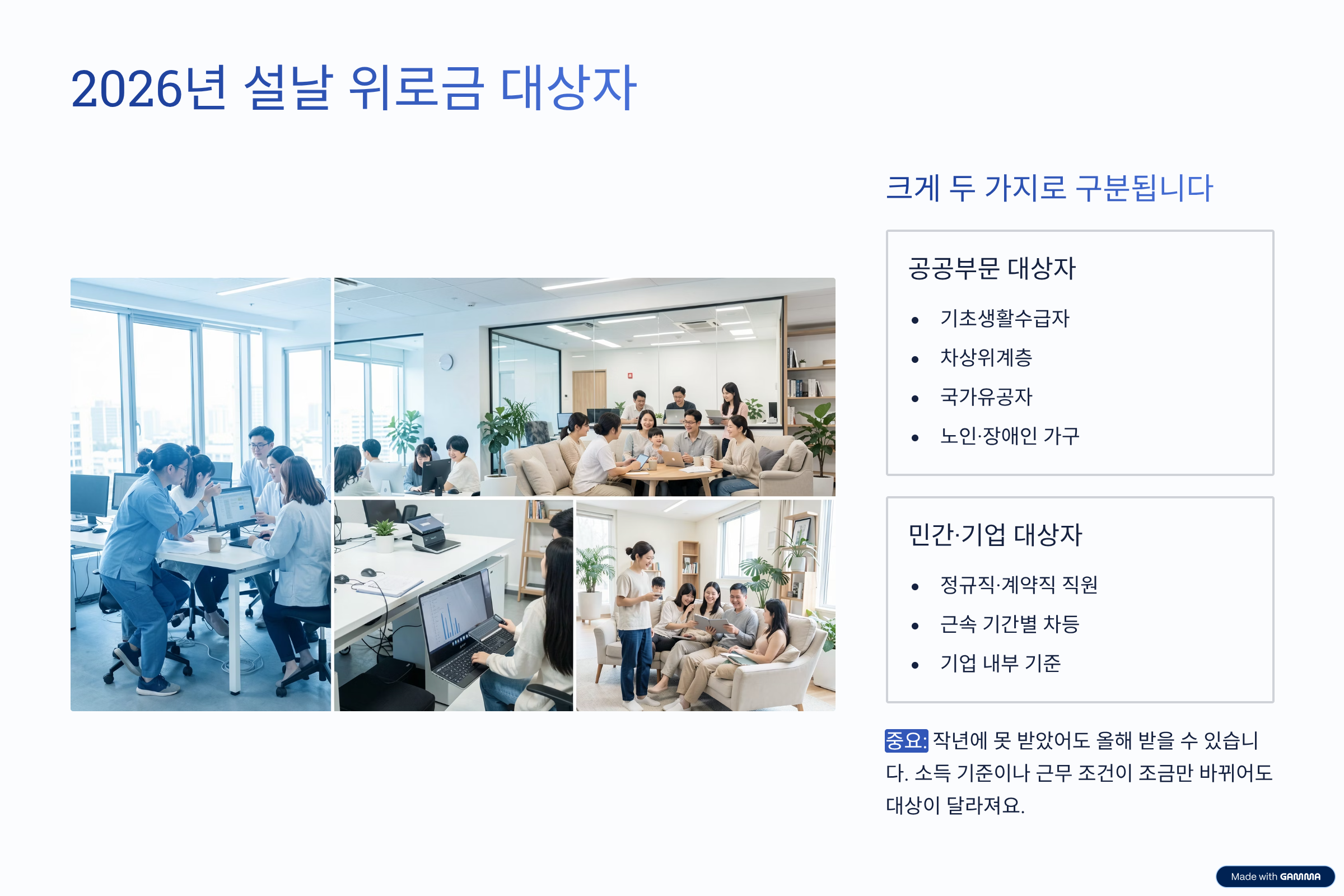 2026년 설날 위로금 대상자는 크게 나누면 공공부문 대상자와 민간·기업 대상자로 구분할 수 있어요. 공공부문에서는 기초생활수급자, 차상위계층, 국가유공자, 일부 지자체의 노인·장애인 가구가 주 대상이 됩니다. 반면 기업의 경우는 정규직, 계약직, 근속 기간 등에 따라 기준이 제각각이에요.