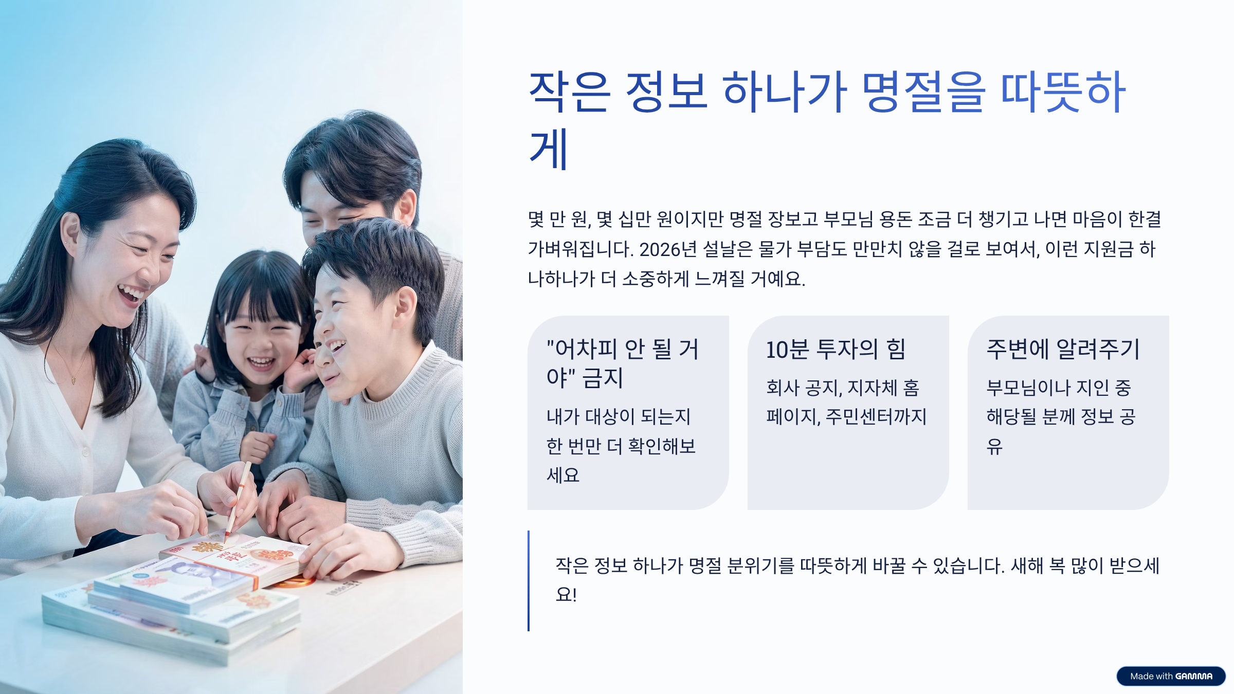 설날 위로금 이야기를 정리하다 보니, 참 사소해 보이지만 생활에서는 꽤 큰 힘이 된다는 생각이 들었어요. 몇 만 원, 몇 십만 원이지만 명절 장보고, 부모님 용돈 조금 더 챙기고 나면 마음이 한결 가벼워지잖아요. 특히 2026년 설날은 물가 부담도 만만치 않을 걸로 보여서, 이런 지원금 하나하나가 더 소중하게 느껴질 것 같아요. 중요한 건 “어차피 안 될 거야” 하고 넘기지 말고, 내가 대상이 되는지 한 번만 더 확인해보는 거예요. 회사 공지, 지자체 홈페이지, 주민센터 안내까지 딱 10분만 투자해도 놓칠 돈은 확실히 줄어듭니다. 혹시라도 주변에 부모님이나 지인 중에서 해당될 것 같은 분이 있다면, 슬쩍 알려주는 것도 좋구요. 작은 정보 하나가 명절 분위기를 꽤 따뜻하게 바꿔줄 수도 있으니까요.