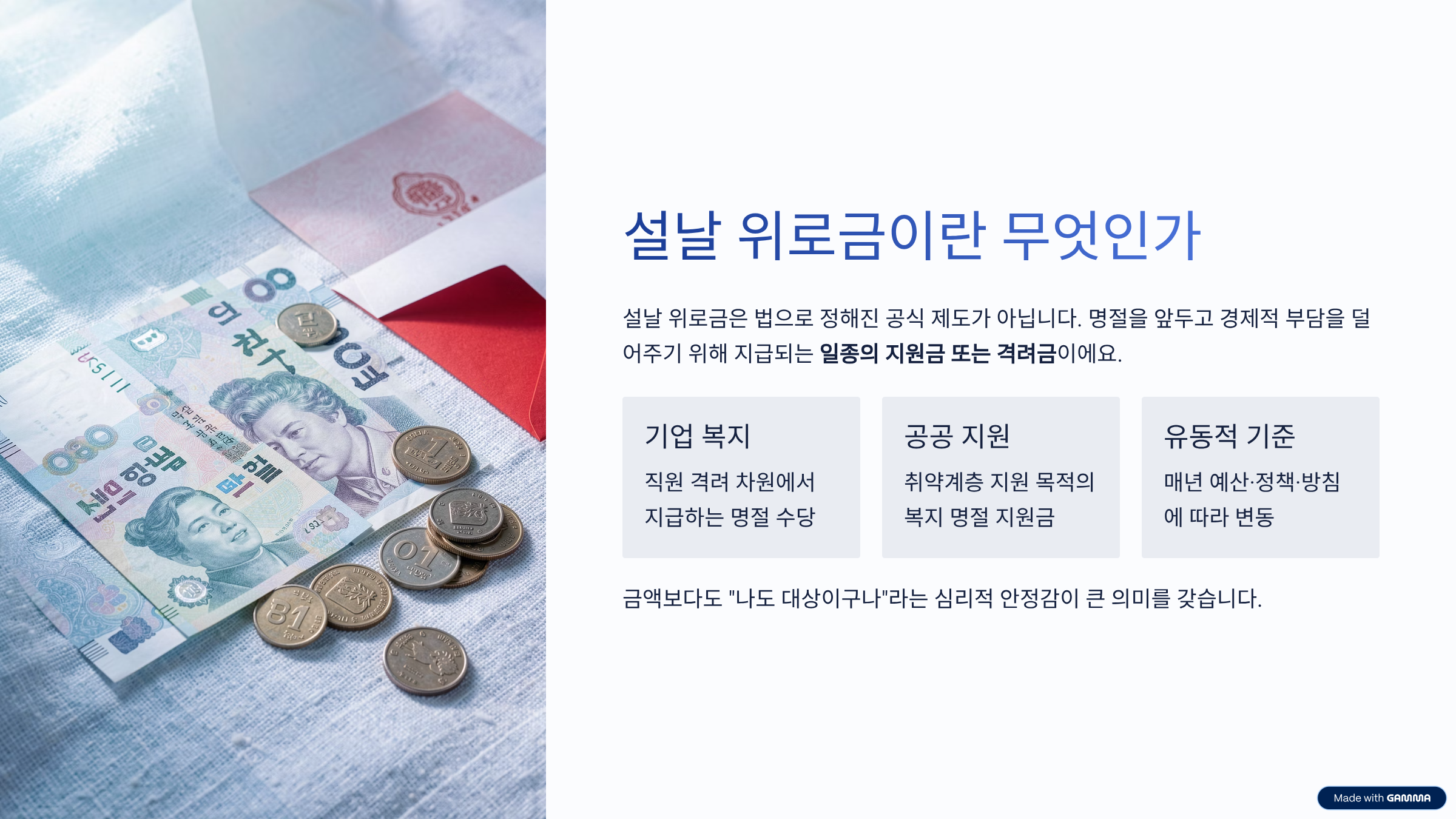 설날 위로금은 법으로 딱 정해진 공식 제도라기보다는, 명절을 앞두고 경제적 부담을 덜어주기 위해 지급되는 일종의 지원금 또는 격려금에 가까워요. 회사에서는 직원 복지 차원에서, 지자체나 공공기관에서는 취약계층 지원 목적에서 지급되는 경우가 많죠. 그래서 “설날 위로금 = 무조건 받는다”라고 생각하면 살짝 곤란해요. 매년 예산, 정책, 기관 방침에 따라 달라지거든요.