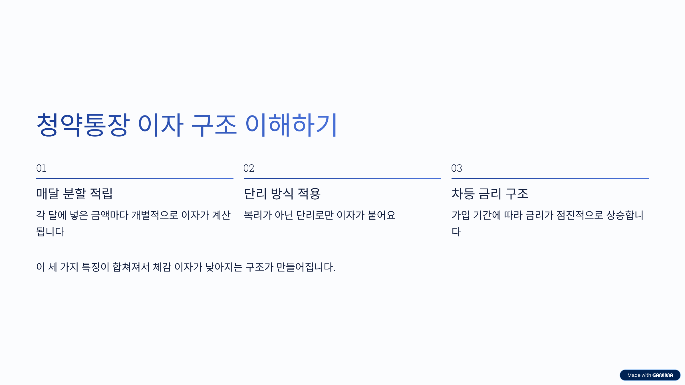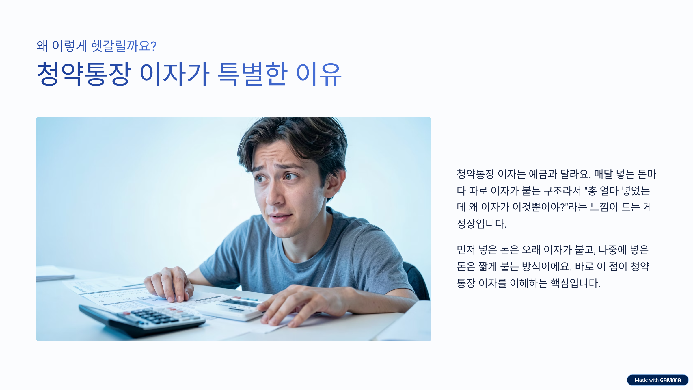 청약통장 이자가 헷갈리는 이유는 구조 때문이에요. 일반 예금처럼 “원금 × 금리 × 기간”으로 단순 계산되지 않거든요. 청약통장은 매달 넣은 금액마다 따로 이자가 붙는 방식이에요. 즉, 먼저 넣은 돈은 오래 이자가 붙고, 나중에 넣은 돈은 짧게 붙는 구조죠.