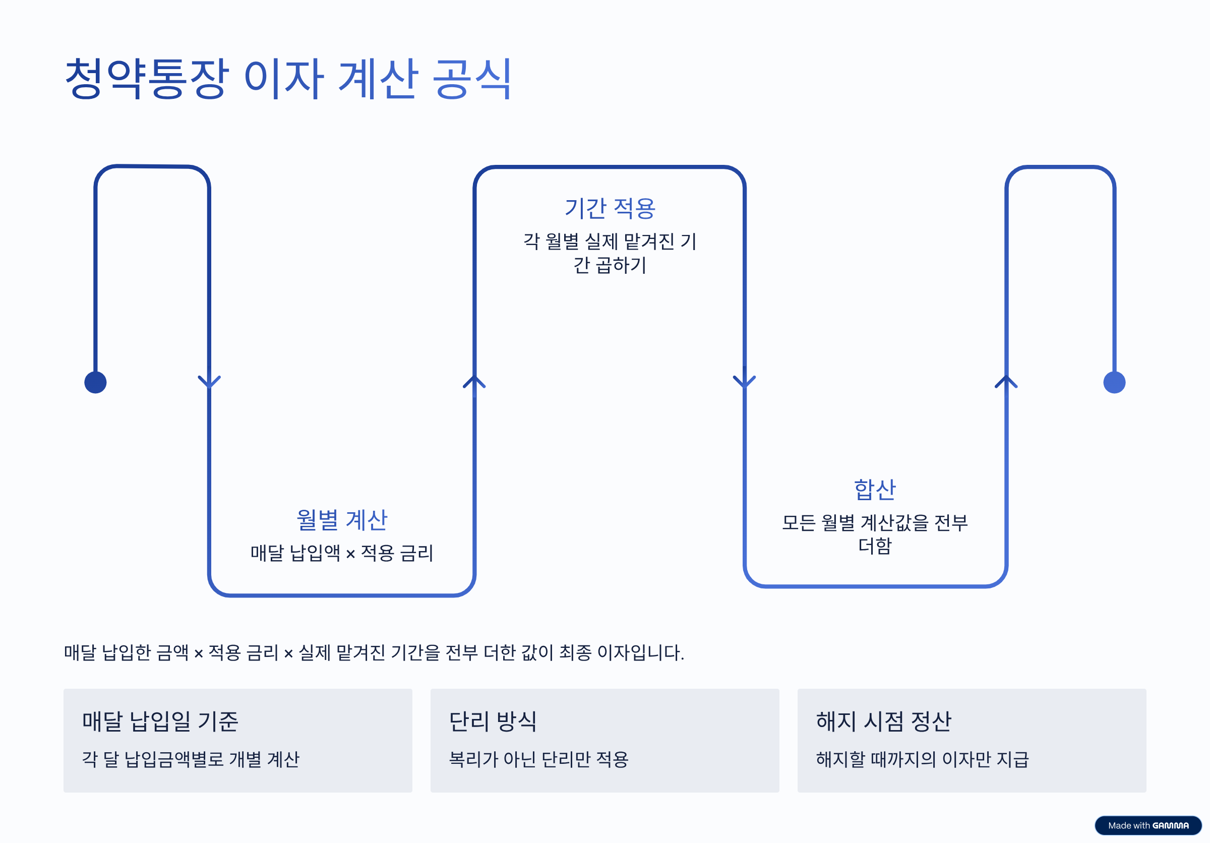 공식처럼 정리하면 이렇게 이해하면 쉬워요. 매달 납입한 금액 × 적용 금리 × 실제 맡겨진 기간을 전부 더한 값이 최종 이자입니다.