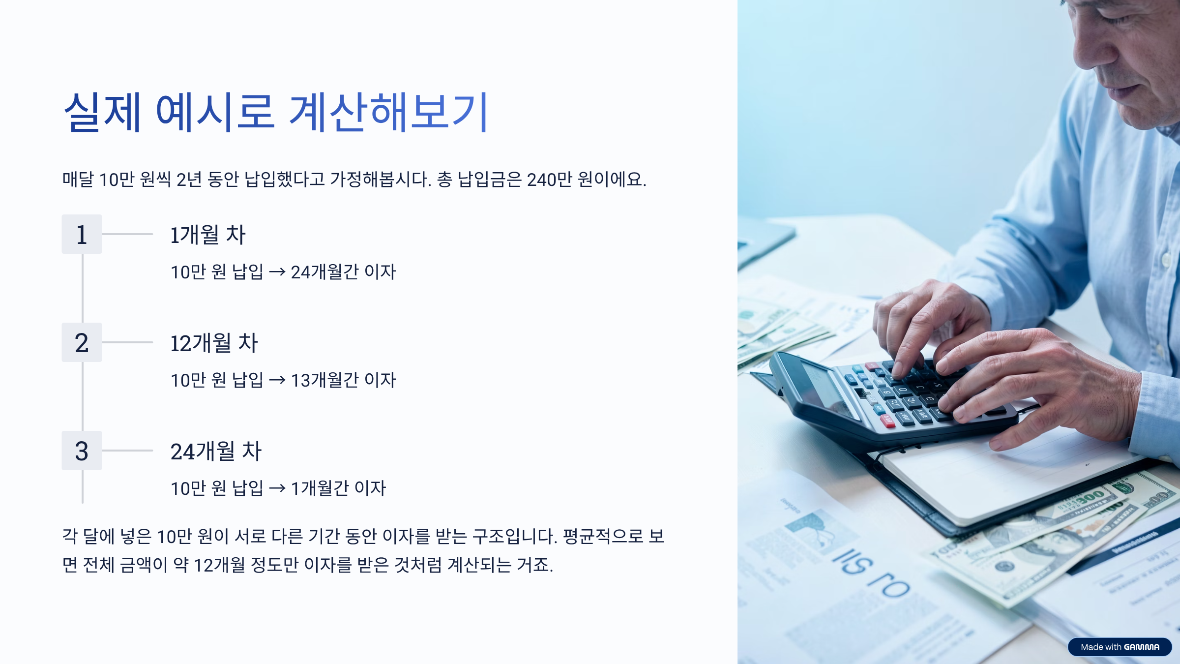 말로만 들으면 감이 잘 안 오죠. 그래서 가장 많이들 사용하는 상황으로 예를 들어볼게요. 매달 10만 원씩 2년 동안 납입했다고 가정해봅시다. 총 납입금은 240만 원이에요. 그런데 이 240만 원에 한 번에 금리를 곱하는 게 아니라, 각 달에 넣은 10만 원이 서로 다른 기간 동안 이자를 받는 구조입니다.