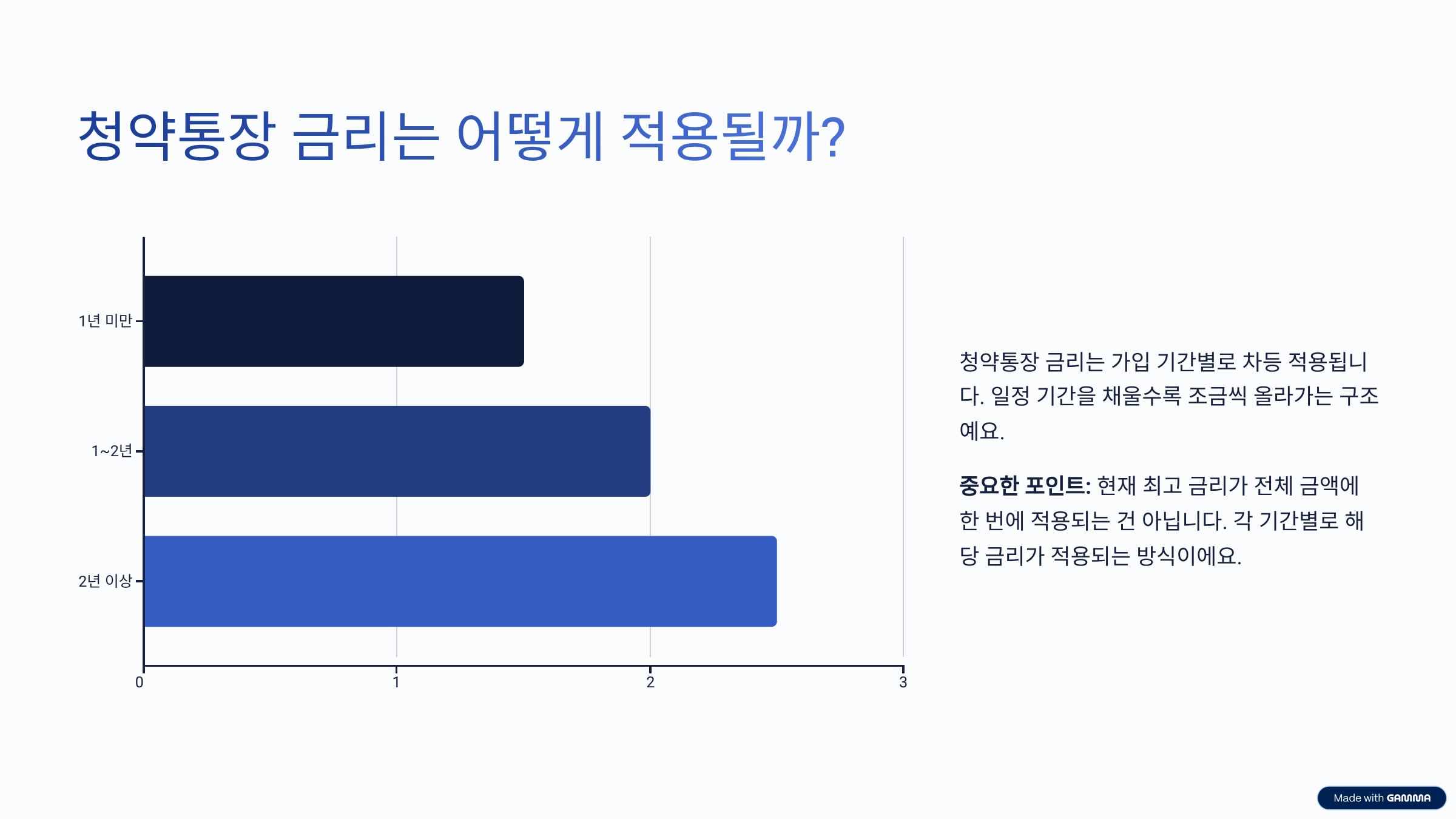 청약통장 금리는 가입 기간별 차등 금리가 적용됩니다. 일정 기간을 채울수록 조금씩 올라가는 구조예요. 다만 중요한 포인트는 “현재 최고 금리가 전체 금액에 한 번에 적용되는 건 아니다”라는 점입니다.